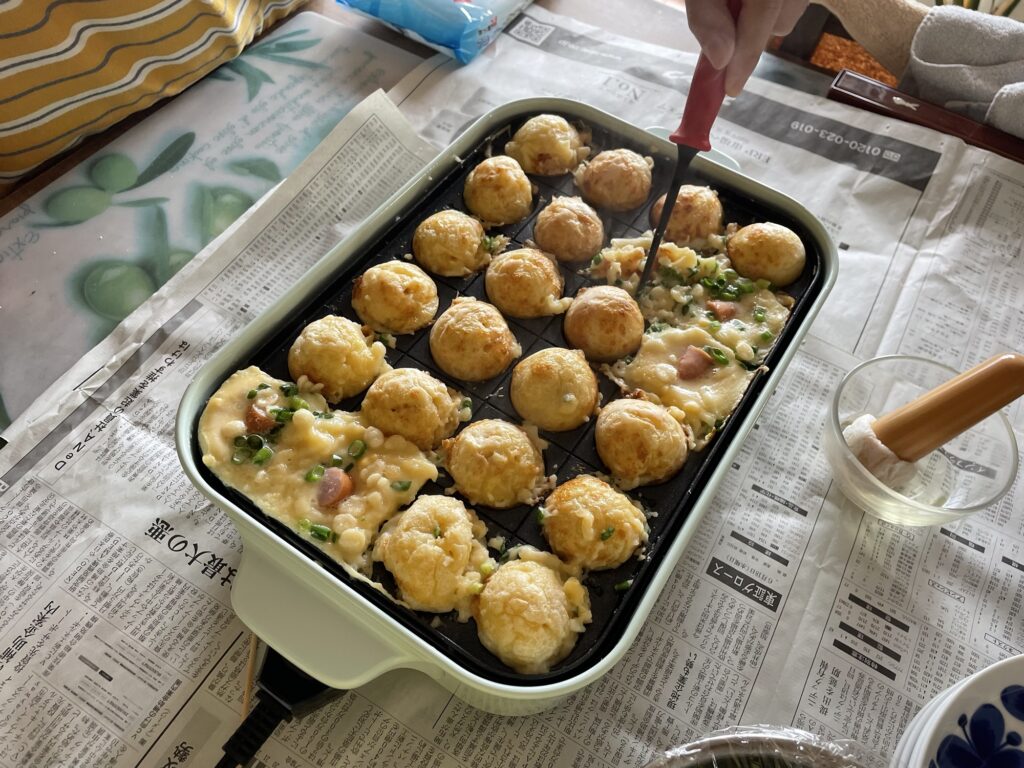 ↑こちらが、我が家が使っているホットプレートです。コンパクトサイズのパステルカラーが、アラフィフの心を爆上げしてくれます。初心者の娘が焼いてくれました。